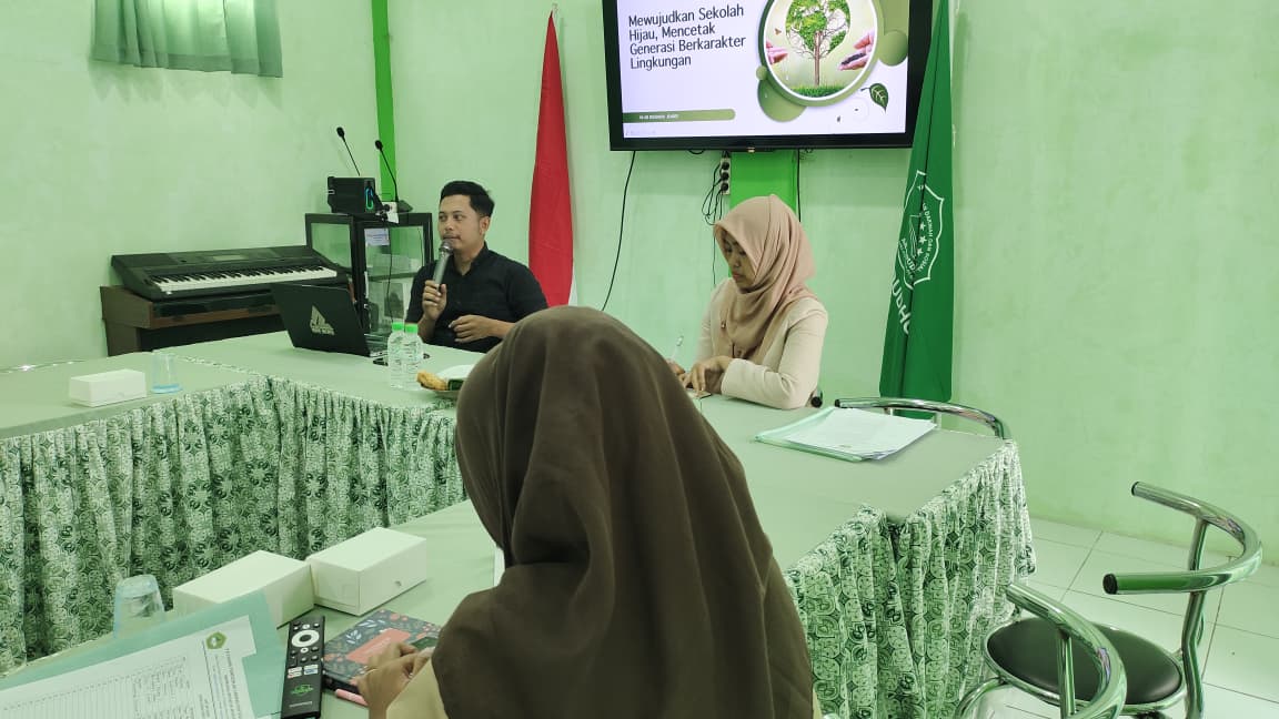 Materi yang disampaikan mencakup konsep dasar sekolah Adiwiyata, pengelolaan lingkungan madrasah, serta pembiasaan perilaku ramah lingkungan yang dapat diterapkan secara berkelanjutan. Para guru tampak antusias mengikuti diskusi dan berbagi pengalaman terkait praktik pembelajaran yang telah diterapkan di madrasah.