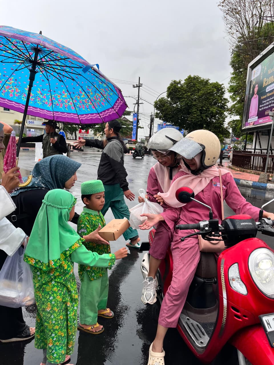 Kegiatan ini menjadi wujud nyata kepedulian keluarga besar TK Ar Roudhoh terhadap sesama, khususnya bagi masyarakat yang sedang dalam perjalanan menjelang waktu berbuka puasa. Meskipun cuaca saat itu diguyur hujan, semangat berbagi tidak surut. Para guru dan perwakilan wali murid tetap antusias membagikan takjil dengan penuh kehangatan dan kebersamaan.